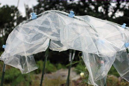 ホームセンターで買った180cmくらいの菜園用ジョイントパイプ(一個2、3百円)を組み合わせてその上に農業用ビニールを貼り、専用の洗濯ばさみ(パッカーと言え)でとめたら完成。