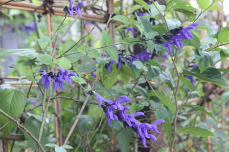 竹ラティスの間から顔を出すサルビア・ガラニチカ。