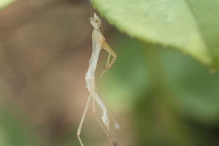 すぐ近くの葉っぱには、このカマキリが脱皮のときに脱ぎ捨てたと思われるぬけがらが↓