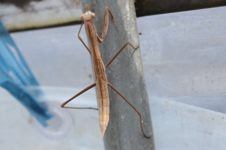 と書きましたが、そんな私の気持ちを汲んでくれたのか(そんなわけはない)茶カマキリがバラのあるハウスに登場。