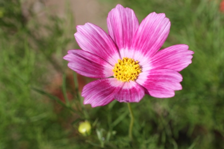 タネまき用の鉢に植えたままなのに、コスモスが咲いてしまいました。