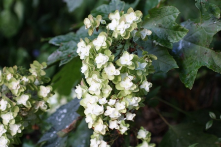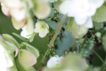 カシワバアジサイは真っ白だった花がグリーンがかってきました。